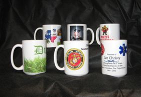 Maverick Awards & Gifts can create beautiful cups using dye sublimation to apply wording, logos, pictures and artwork to 11 ounce and 15 ounce cups. Other styles of drinkware are also available. Dye sublimation uses a special ink that under heat and pressure vaporizes permanently into the material.